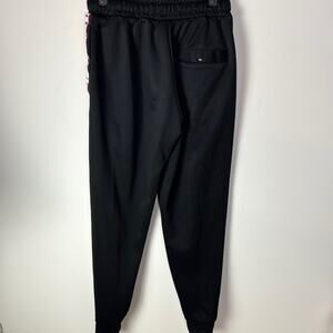 Gently Used Nike Air Jordan Joggers. These are a men's small. Mostly black. Striping down the sides with red, white, and black Air Jordan text design repeating. Jumpman Air logo on one leg. Front pockets. Back button pocket. Originally from 2018 and still in excellent condition!