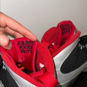 Features a metallic silver and black upper with red accents and “Kilroy” branding on the tongue – a nod to MJ’s fictional post-retirement alter ego.