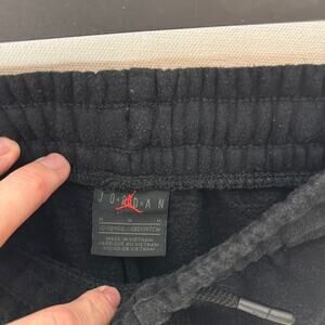Gently Used Air Jordan Sweat Shorts. These are a boys medium (10-12 yrs).Black throughout. Side pockets. White Jumpman logo by the leg. 60% cotton, 40% polyester.