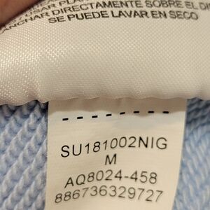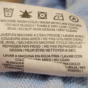 Very fun baby blue sweat shorts that are splotch dyed. Pocket in the back has a button to insure your important items don't fall out. The tabs on the draw string are a little damaged, only noticeable if your looking directly at them. While worn you will not see it.