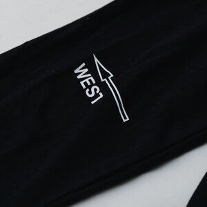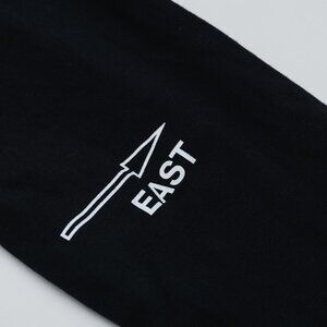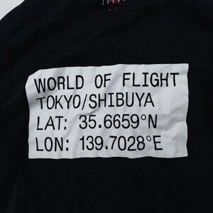 The shirt is a classic black long sleeve with unique, detailed graphics. The front features the "World of Flight Tokyo/Shibuya" lettering along with the precise geographical coordinates for the store's location. The back has "WORLD OF FLIGHT" printed vertically down the center. Each sleeve has a printed arrow and a cardinal direction (East, West, South West, North East), adding to the travel-inspired theme. The Jumpman logo is also subtly featured on one of the sleeves.