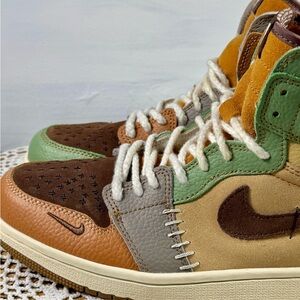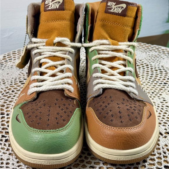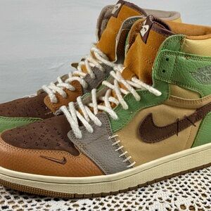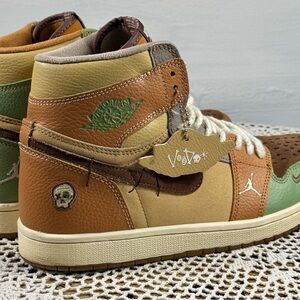 The product is a men's size 11 Air Jordan Zion Williamson x Jordan 1 High Top…”Voodoo' sneaker. This high top athletic shoe features a multicolor design and belongs to the Air Jordan product line. With the iconic Jordan brand and sneaker style, this shoe combines style and performance for basketball enthusiasts or sneaker collectors. The design collaboration with Zion Williamson adds a unique touch to this sought-after sneaker model.