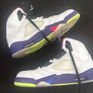 Stylish Jordan sneakers. White base with black laces. Purple and neon accents. Colorful inner lining. Iconic Jumpman logo. Great condition
