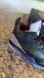 Stylish Air Jordan sneakers in black and purple. Features a unique pattern on the heel.
