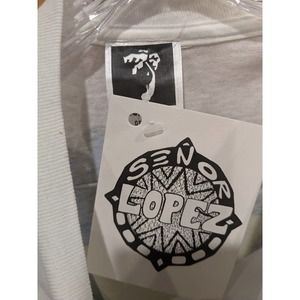 This Senor Lopez vintage T-shirt is perfect for any casual occasion. With a crew neck and short sleeves, it features a white 100% cotton knit fabric with a Stitch logo accent. The easy to care for, machine-washable shirt has a regular fit and is available in size L.