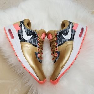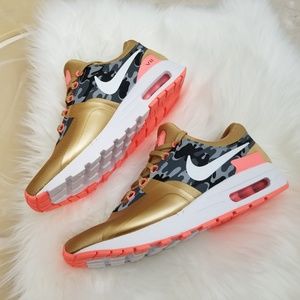 Features a metallic gold upper with grey camo and peach accents and a white Swoosh. It also comes with a white midsole and a peach Air Max unit with a matching rubber outsole.
