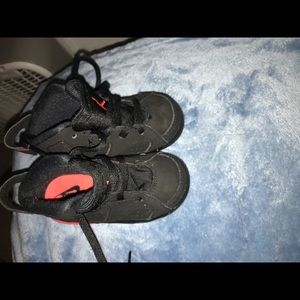 Black air Jordan’s with orange around the bottom . Size 7c my son outgrew them worn twice nothings wrong with them comes with box as well . Comes from smoke free home