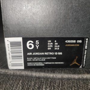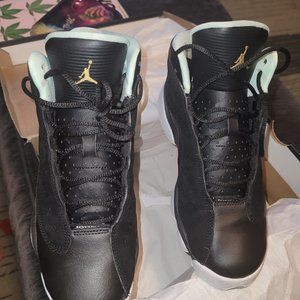 USED A grade-school exclusive, the Air Jordan 13 Retro GS 'Mint Foam' features a subdued colorway with a vibrant accent. The black suede and leather upper sports Mint Foam on the outsole and inner lining, with a gold Jumpman on the tongue adding another hit of color. The podular midsole appears in contrasting white.
