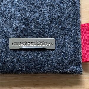 Collectible American Airlines retro themed AirCal amenity bag, designed with a gray felt exterior and a vibrant sunset livery multicolor interior.