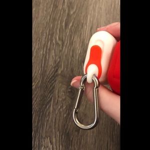 Brand new and never used, white with red detail AirPod case. Comes with a silver carabiner and has a charging port protection flap.