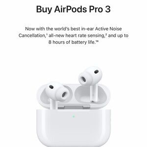 The internal architecture has been completely rebuilt for better acoustic performance, and the external geometry has been redesigned for a more secure fit. With improved battery life, you can get up to 8 hours of listening time with Active Noise Cancellation on a single charge. Footnote ¹⁴ And AirPods Pro 3 are the first AirPods to have an IP57 rating for improved dust, sweat, and water resistance. Footnote ²⁵