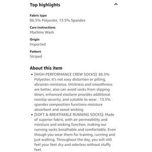 [HIGH PERFORMANCE CREW SOCKS]: 86.5% Polyester, it's not easy distortion or pilling, abrasion resistance, thickness and smoothness are better, also can avoid socks from slipping down, enhanced elastane provides additional nonslip security, and suitable to wear . 13.5% spandex composition functions moisture absorbent and sweat wicking.