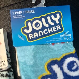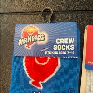 Enjoy comfort and style with these Airheads and Jolly Rancher crew socks. Featuring vibrant blue and light blue colors, these socks are perfect for adding a playful touch to your outfit. Kids size 9-3.5 & 7-10. Stretchy
