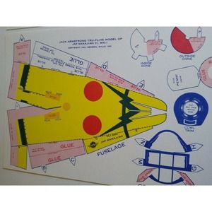 New old stock General Mills cereal premium paper cutout airplane. Comes in two parts as shown. The section with wings is a bit thicker. Copyright date is 1944. One sheet is 6" x 10.25". The other is 4" x 6".