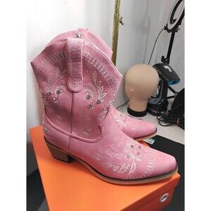 The Aiwglesol Pink Leather Cowboy Anklet Boots are stylish and versatile, perfect for various occasions from casual to workwear. Featuring a pointed toe, zip closure, and mid heel, these ankle boots are made of faux leather with rhinestone and embroidered accents. The pink color adds a pop of fun while the lightweight design and memory foam insole ensure comfort. This western-inspired footwear is a fashionable choice for the fall, winter, and spring seasons, making it a must-have addition to any woman's wardrobe.