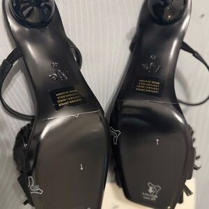 These elegant black heels by Aje feature thin ankle straps, large fluffy pom-poms, and a high heel for a sophisticated look.
