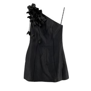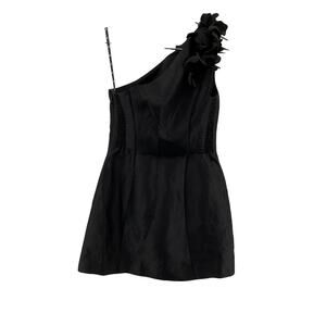 Aje 'Camille' Black Linen Mini Dress Size 10: designed for a close fit, mid-weight, non-stretchy fabric, one-shoulder design, princess panel seams with contrast piping, floral motifs, side zip, hook and eye closure, measurements: 16 inch bust width x 14 inch waist width x 20 inch hip width x 31 inch lemgth.