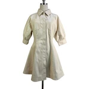 New with tags, unused, no flaws or odors. The Claire Pearl Mini Dress in Sandstone Beige by Aje is a vegan PU leather mini dress featuring front chest pockets, button up front, blouson sleeves with cuff, and pearl stud embellishment. Fully lined. Each Claire Pearl Mini Dress is designed to flatter the female form, with expert tailoring that accentuates curves.
