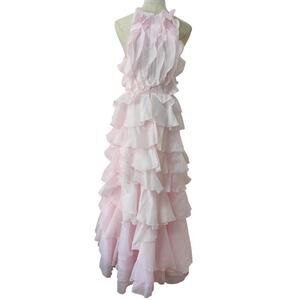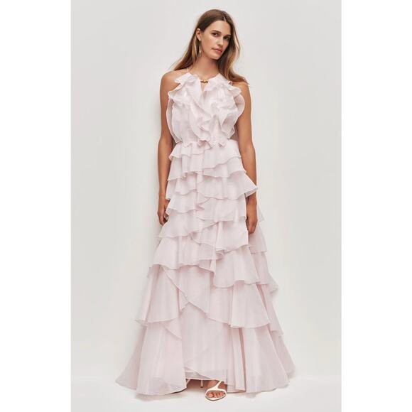 Voluminous skirt features layered circular cut ruffles and horizontal frills for elegant movement