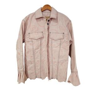 Aje Epacris Embroidered Denim Jacket in Pink. Size 12. Features collar, long sleeves with ruffled cuffs, front button closure, flap pockets, embroidered details, and scalloped hem. 100% Cotton. NWOT / New without tags.