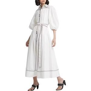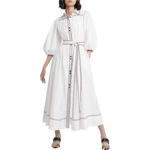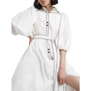 Featuring a collared neckline, button-down front, and contrast stitching throughout. Designed with voluminous 3/4 balloon sleeves with elastic cuffs, on-seam hip pockets, and a removable tie belt with signature hardware for versatile styling. Mid-length silhouette with a lined finish. Material: 100% cotton, mid-weight non-stretch shirting. Made in China. Fits true to size