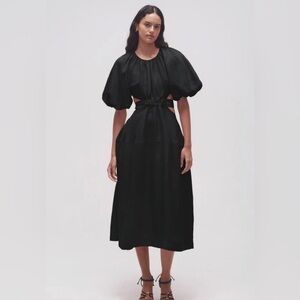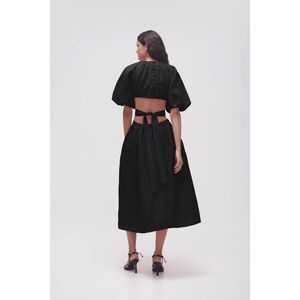 "An iconic Aje style, the Mimosa Cut Out Midi Dress features short puff sleeves, a waist cut out with self ties and a buoyant midi skirt with side seam pockets. Wear this dress to your next special event with strappy heels and dainty jewellery."