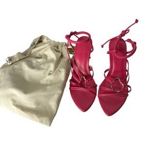 Aje Mirage Leather Strappy Heel in Rouge Pink. Size 38 (US 8). Features pointed toe, stiletto heels, strappy leather upper with gold-tone ring accent, lightly padded footbed, leather sole, and drawstring ankle strap. Excellent pre-owned condition. Dust bag included.