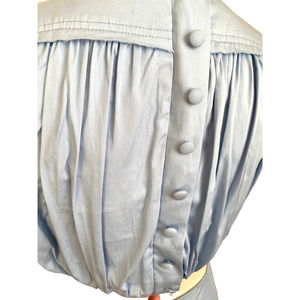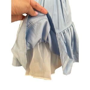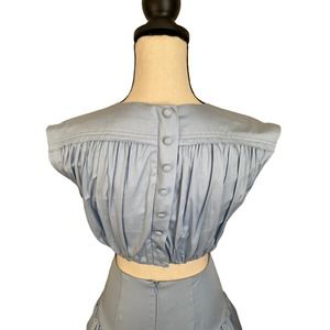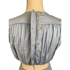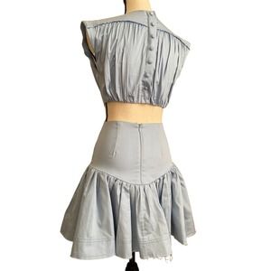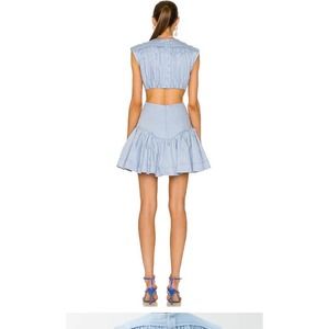 Aje Solstice Ring Embellishment Cut-out Cotton Mini Dress features a gold ring and cut out in center, open back, blue cotton soft color. Note see designers size chart for accuracy in addition I have listed measurements. NOTE last button on back is missing shown on photos. I do not have the replacement. Other than this dress is like new and worn gently.