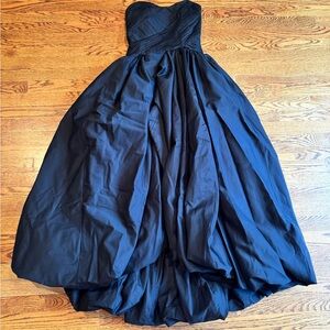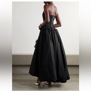 Aje's 'Spatial' gown takes its name from the beautiful fit-and-flare shape. Made from lustrous black cotton-sateen, it has a ruched bodice and falls to a draped skirt with a high slit and asymmetric bubble hem. Complement the strapless sweetheart neckline with drop earrings.