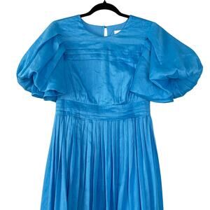 Aje Sylvia Dress Pintuck Midi Puff Sleeve Silk Linen Pleated Azure Blue Size 2
