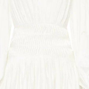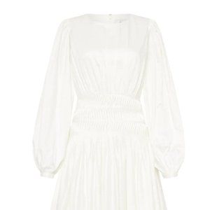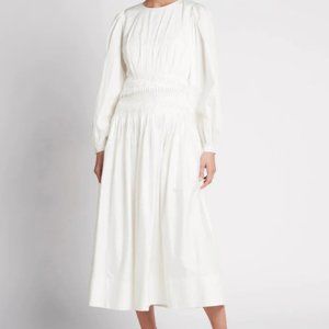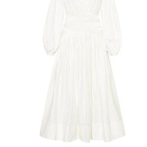 "A falling voluminous skirt is sculptured by signature corsetry with a fitted waist and swirl pleat detail throughout. A heavy full midi length skirt gathering creates a soft yet structural feel, finished with an invisible zipper and fully lined. "
