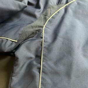 Experience comfort and style with this navy windbreaker with thin lining jacket. Ideal for any casual outing. Jacket has small areas of white on front lower area. See pics for details, otherwise jacket in good shape.