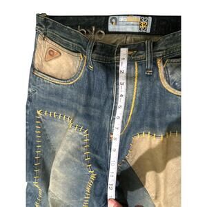 • Design Elements: These particular jeans stand out with their distinctive patchwork detailing and prominent, contrasting stitching, adding to their unique aesthetic. Material: Typically made from durable cotton denim, offering both comfort and longevity.