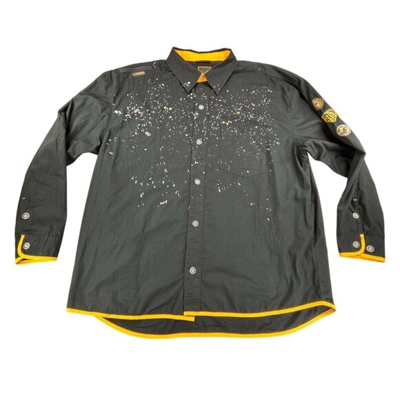 Akademiks Shirt Black Mens XL Long-Sleeve Button-Up Yellow Trim & Patches