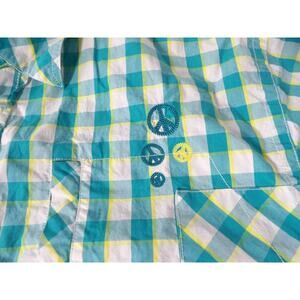 Akademiks Shirt XL Plaid Teal Yellow White Button Up Y2K Hip Hop Colorful Logo Casual