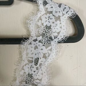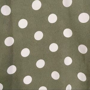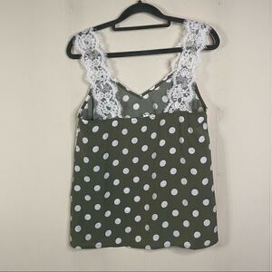 This cute top is in excellent pre-owned condition. It is olive green with white polka dots. The trim and straps are lace. The straps aren’t adjustable.