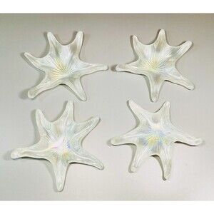 The Akcam Turkish Glass Starfish Dishes are a set of four pearlescent white starfish plates, each measuring 7 inches in length. Excellent condition,never used,no chips or cracks.