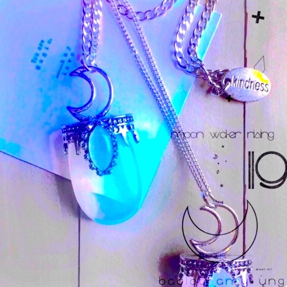༟༟cute silver stainless steel chain, pink rose quartz (affection) or opalite natural stone celestial hollow out moon metal crown🌙