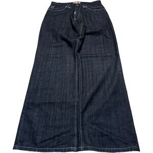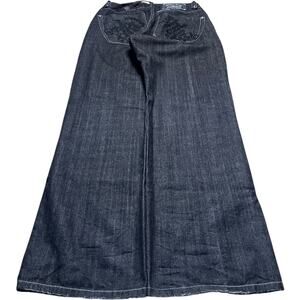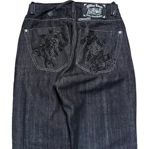 Dark wash Akdmks Jeanius House jeans featuring extra wide leg fit, rhinestone detailed back pockets, and gothic “Home of the Dark Knights” patch on waistband. Statement streetwear piece with bold Y2K aesthetic. Perfect condition. Can’t find any other online.