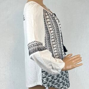Akemi + Kin Anthropologie embroidered blouse! Featuring intricate black on white embroidery and 3/4 sleeves, this blouse exudes effortless elegance. Perfect for adding a touch of artisanal flair to any ensemble!