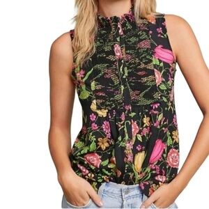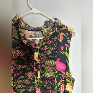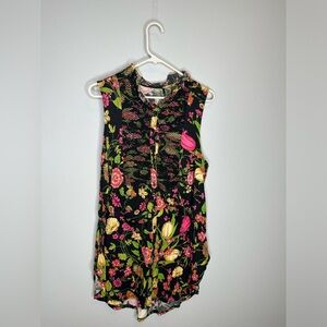 Akemi Kin Anthropologie Knit Button Up Top L Black Floral Sleeveless