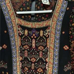 Vibrant bohemian dress with intricate patterns. Long sleeves and flowing design. Perfect for casual outings.