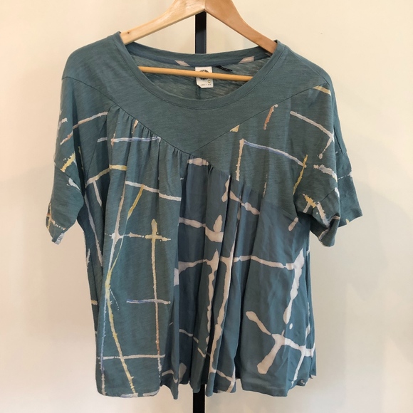 Body is 100% cotton, Woven Tissue is 100% Rayon. The mix of fabrics gives it a unique look for a knit. Purchased from Anthropologie
