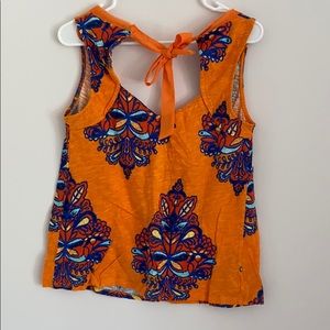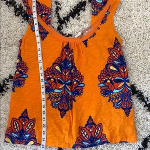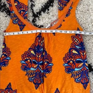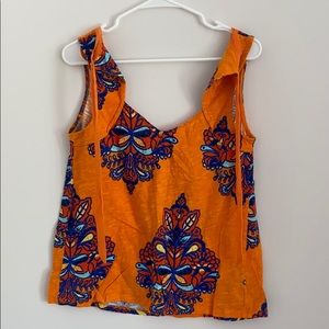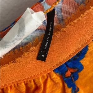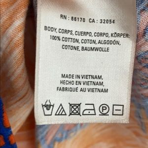Orange base with blue, dark orange, and yellow floral design. Super lightweight and perfect for summer. has a tie in the back (second photo).