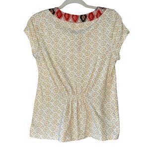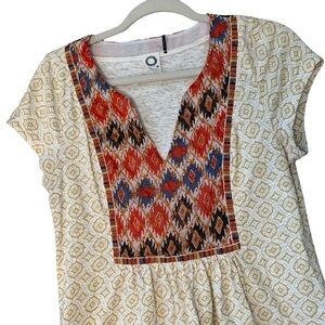 Akemi + Kin by Anthropolgie white Honey Valley pattern Aztec ikat embroidered front in red, blue and black with orange curried star embroidery, v neck, cap sleeve, slight peplum with smocked gathered back at waist for more movement. Size M