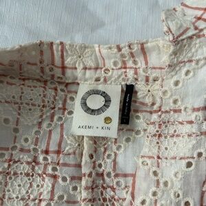 This elegant Akemi & Kin women's top features a delicate embroidered lace design in a soft white and red color. Features layers of sheer ruffles at arms and bottom. Size large approximate measurements 28” length, 23” across chest