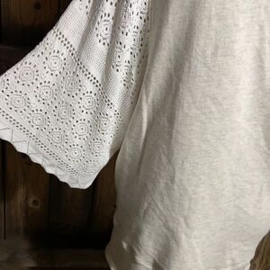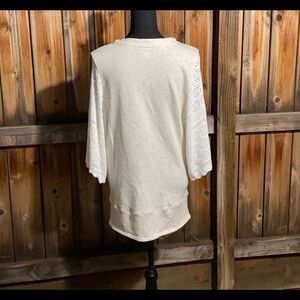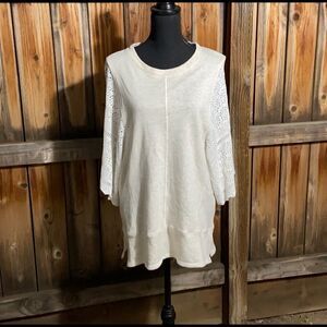 Akemi + Kin top has kimono3/4 sleeves of lace/crochet and sweatshirt type material with side vents