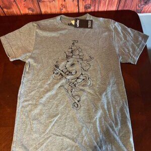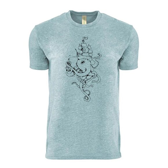 Akinz Hand-Printed Octopus & Ship Design T-Shirt Gray Crew Neck organic tee