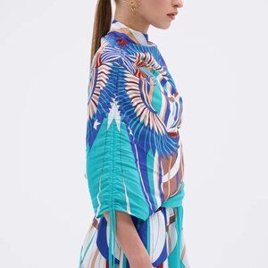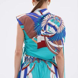 Ashtin Printed Blouse - features an asymmetrical draped silhouette and a vibrant multicolor graphic print. features a high mock neck, gathered shoulder with functional drawstring ruching, and short sleeves. The wrap-effect waist cinches with adjustable side ties, creating a sculpted finish that flatters the figure.