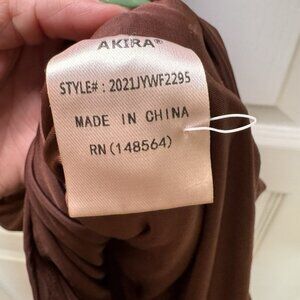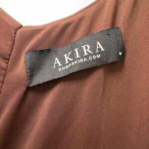 The Akira Brown Ruched Midi Dress in size medium is a stylish and elegant bodycon dress perfect for special occasions like weddings or parties. Featuring a flattering sleeveless design with a riched style, this dress in a rich chocolate brown color is sure to make a statement. The ruched detailing adds a touch of sophistication to the midi-length silhouette, making it a versatile and chic option for any woman's wardrobe.